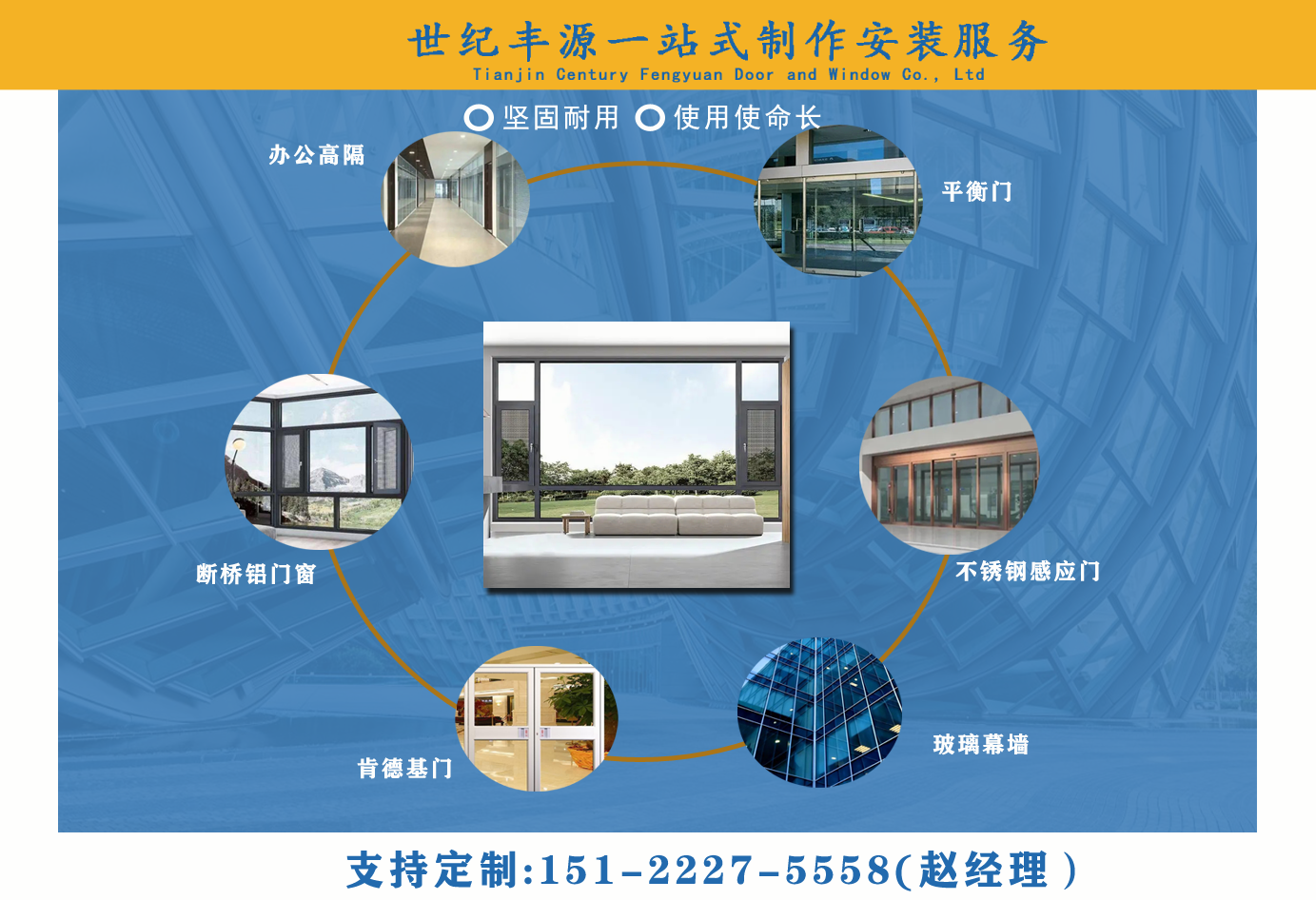 天津世紀(jì)豐源門窗有限公司從事斷橋鋁門窗,玻璃幕墻,平衡門,肯德基門,不銹鋼感應(yīng)門,百葉窗,辦公高隔,制作安裝一站式訂制生產(chǎn)及配套服務(wù)等?! 」咀猿闪⒁詠恚冀K堅(jiān)持以人才為本、誠信立業(yè)的經(jīng)營原則,薈萃業(yè)界精英,成熟的技術(shù)、管理方法及企業(yè)經(jīng)驗(yàn)與國內(nèi)企業(yè)的具體實(shí)際相結(jié)合,為企業(yè)供給各個(gè)方面的解決方案,使企業(yè)在激烈的市場(chǎng)競(jìng)爭(zhēng)中始終堅(jiān)持競(jìng)爭(zhēng)力,實(shí)現(xiàn)企業(yè)快速、穩(wěn)定地發(fā)展?! ≠|(zhì)量好、服務(wù)好、才能信譽(yù)好,公司已在諸多領(lǐng)域取得輝煌成績,愿意成為您可信賴的長期合作伙伴。 讓我們攜手同行,共同實(shí)現(xiàn)“讓普通老百姓都用得上高端門窗”...